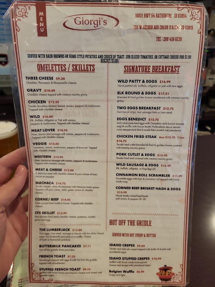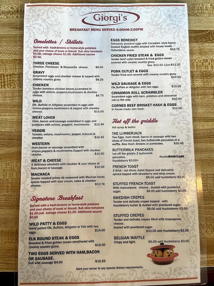 The menu at Giorgi's is extensive, showcasing 65+ delicious dishes. It offers familiar American breakfast favorites alongside unique wild game options. Choices range from the classic pancakes to hearty grilled steaks. Breakfast lovers can savor a variety of omelets, skillets, and signature breakfasts. The chicken fried steak and biscuits with gravy stand out as must-tries. There’s also a delightful kids’ menu ensuring everyone can find something.